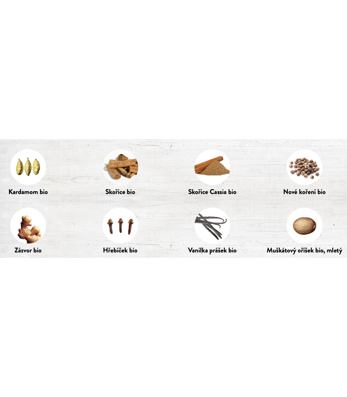 Složení: Kardamom BIO, Skořice BIO, Skořice Cassia BIO, Nové koření BIO, Zázvor BIO, Hřebíček BIO, Vanilka prášek BIO, Muškátový oříšek mletý BIO