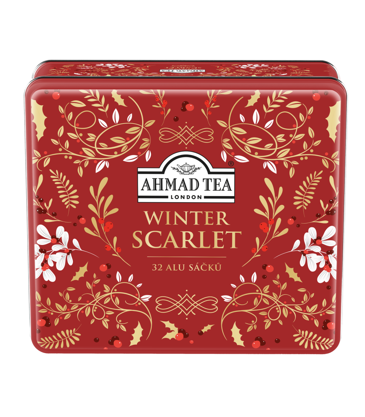 Elegantní kazeta Ahmad Tea Winter Scarlet přináší 32 čajových sáčků ve čtyřech oblíbených směsích: