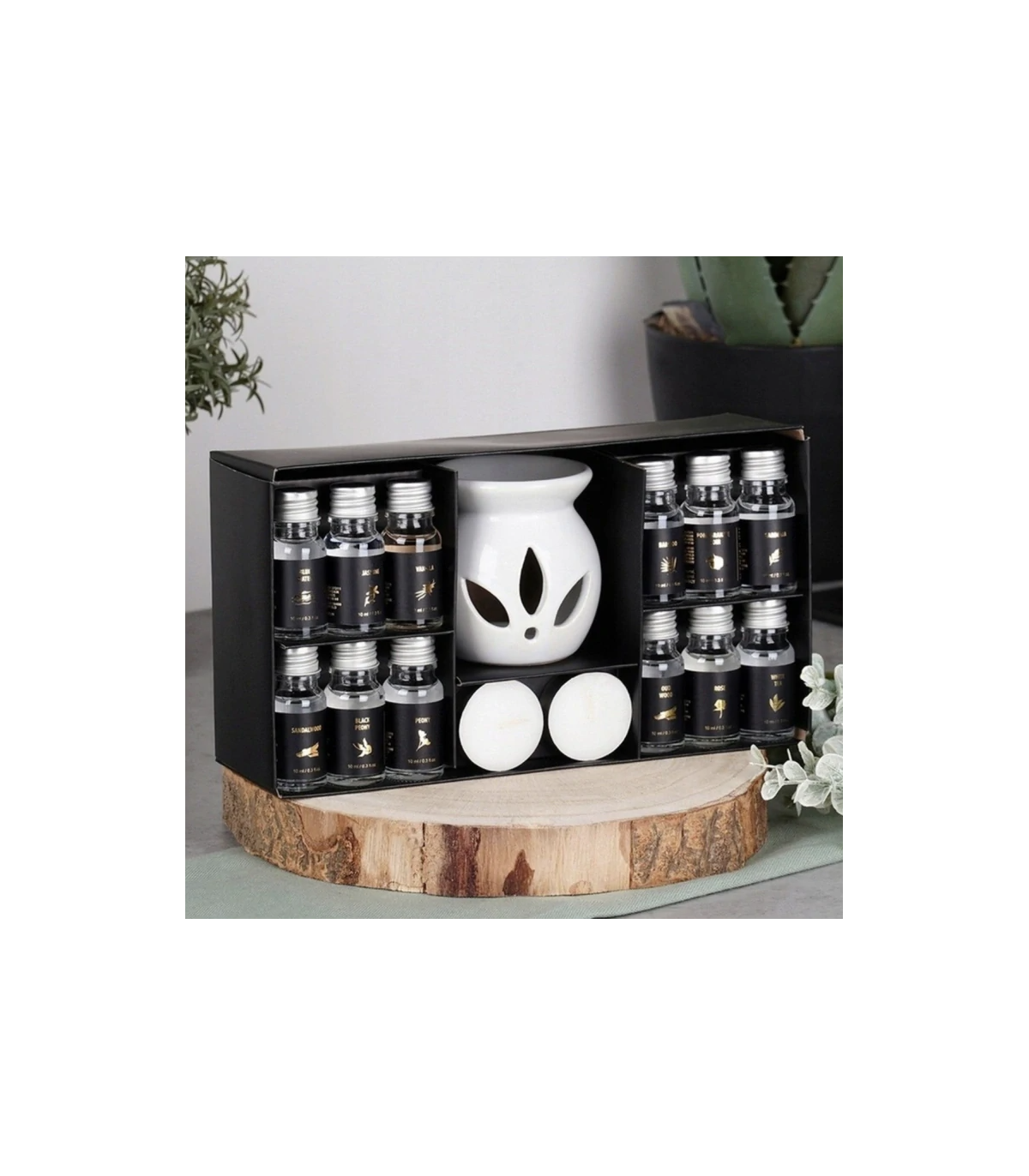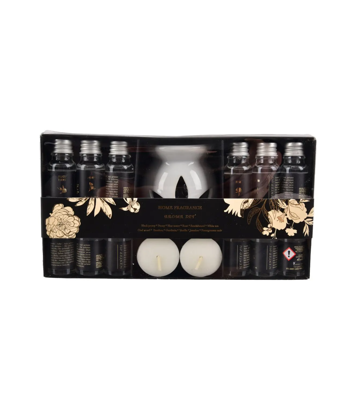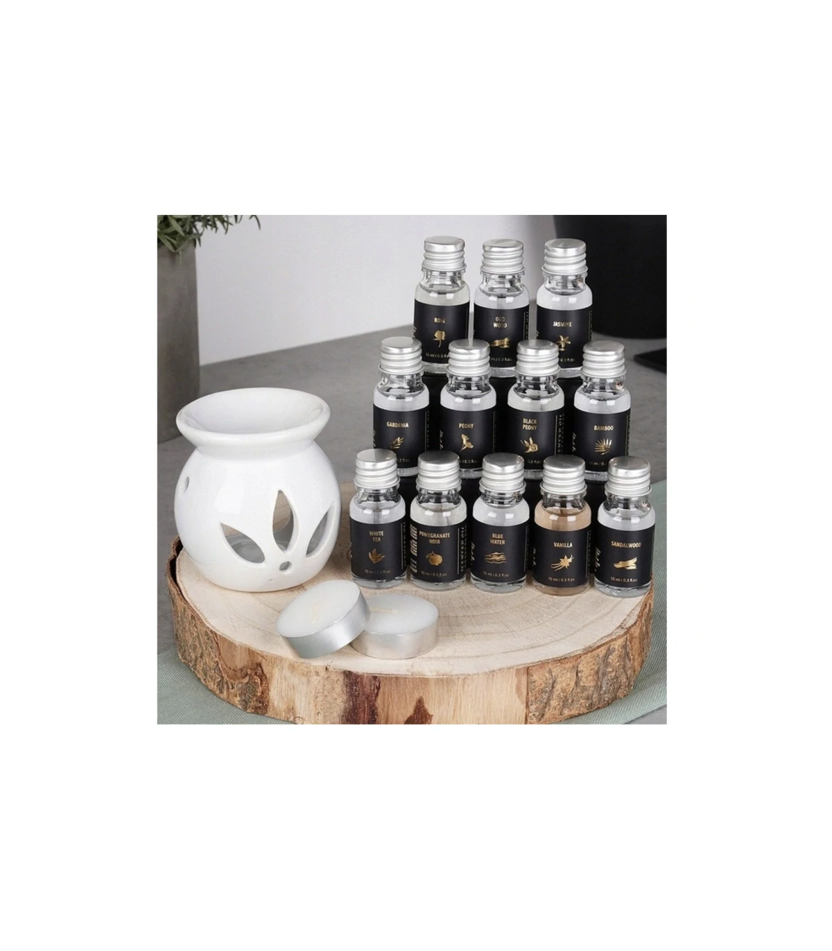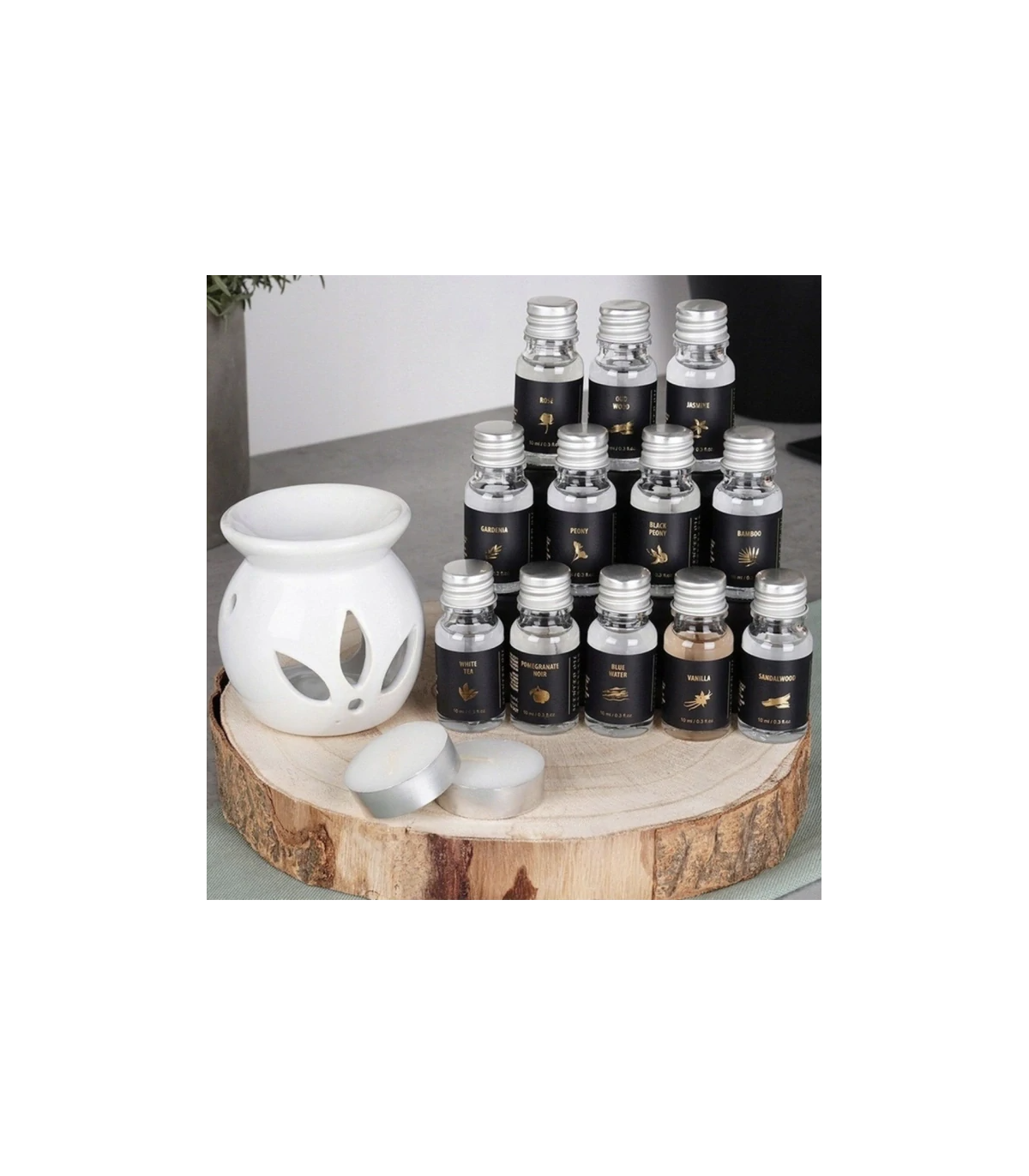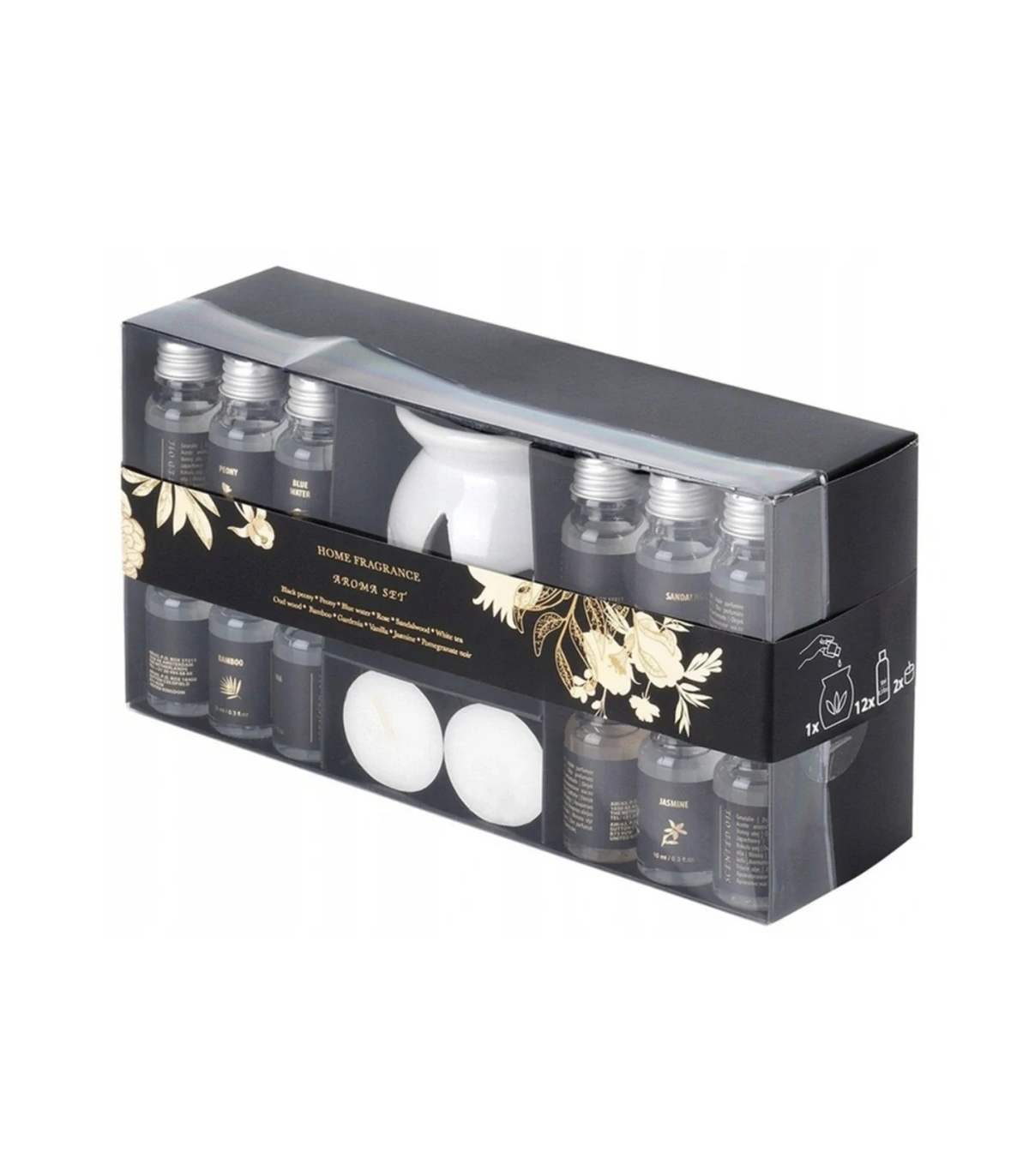 - 12x esenciální vonný olej o objemu 10 ml (aroma: černá pivoňka, granátové jablko, bambus, vanilka, bílý čaj, růže, pivoňka, santalové dřevo, gardenie, jasmín, oud wood (staré dřevo), blue water (čistá vůně)