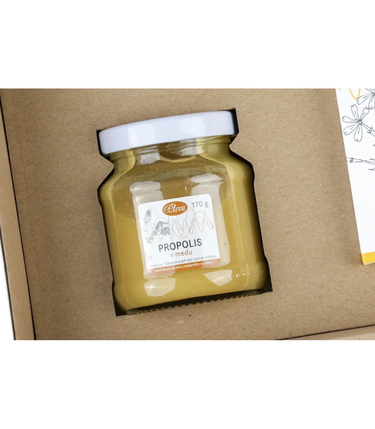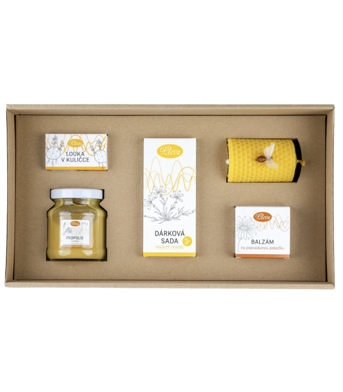 Tato krásná dárková sada obsahuje to nejlepší, co včelky nabízí. Propolis v medu s příjemnou příchutí propolisu je vhodný nejen k vnitřnímu užití – například do čaje, ale i na mazání povrchových ran, protože zabraňuje infekci. Součástí balíčku je také sada mýdel se včelími poklady, dále pak praktický propolisový balzám na popraskanou pokožku, voňavá svíčka a Louka v kuličce, což jsou semínkové kuličky. Krásný dárek pro vaše blízké, co říkáte?