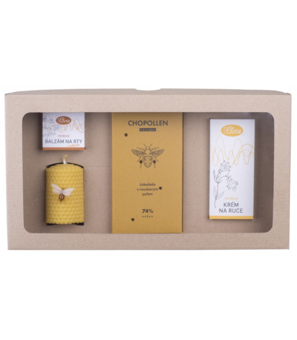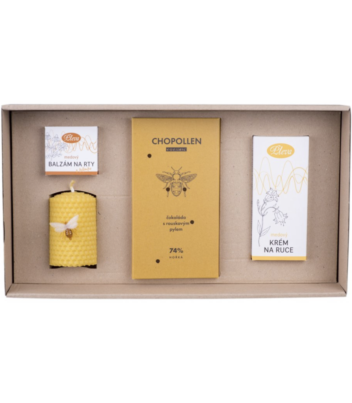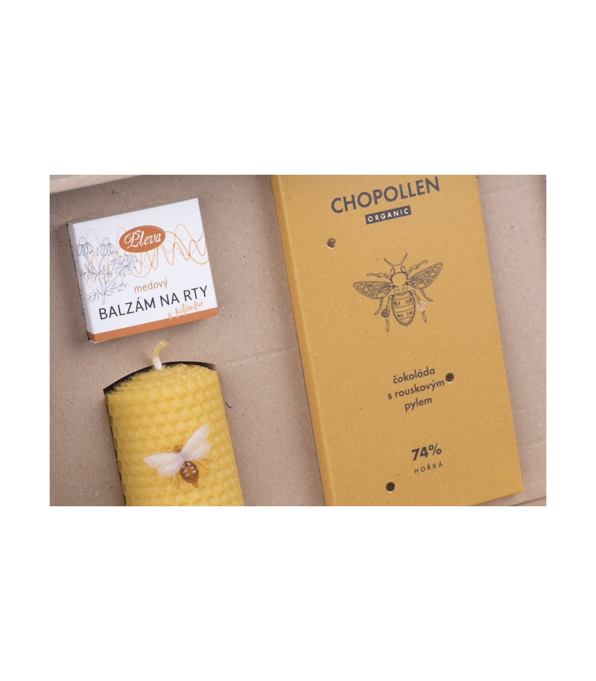 Přírodní dárková sada plná zdraví a péče kombinuje originální a oblíbené včelí produkty a je okouzlujícím dárkem, s kterým nemůžete šlápnout vedle. Sada obsahuje medový krém s včelím voskem pro hebkou a provoněnou pokožku, balzám na rty s propolisem nebo svíčku z včelího vosku s jemnou medovou vůní. Zajímavostí je kvalitní hořká čokoláda s rouskovým pylem, která přináší neodolatelnou kombinaci a chuťový zážitek.