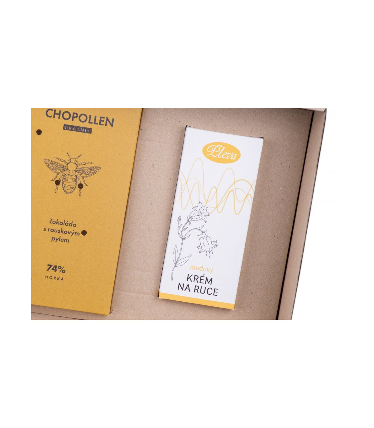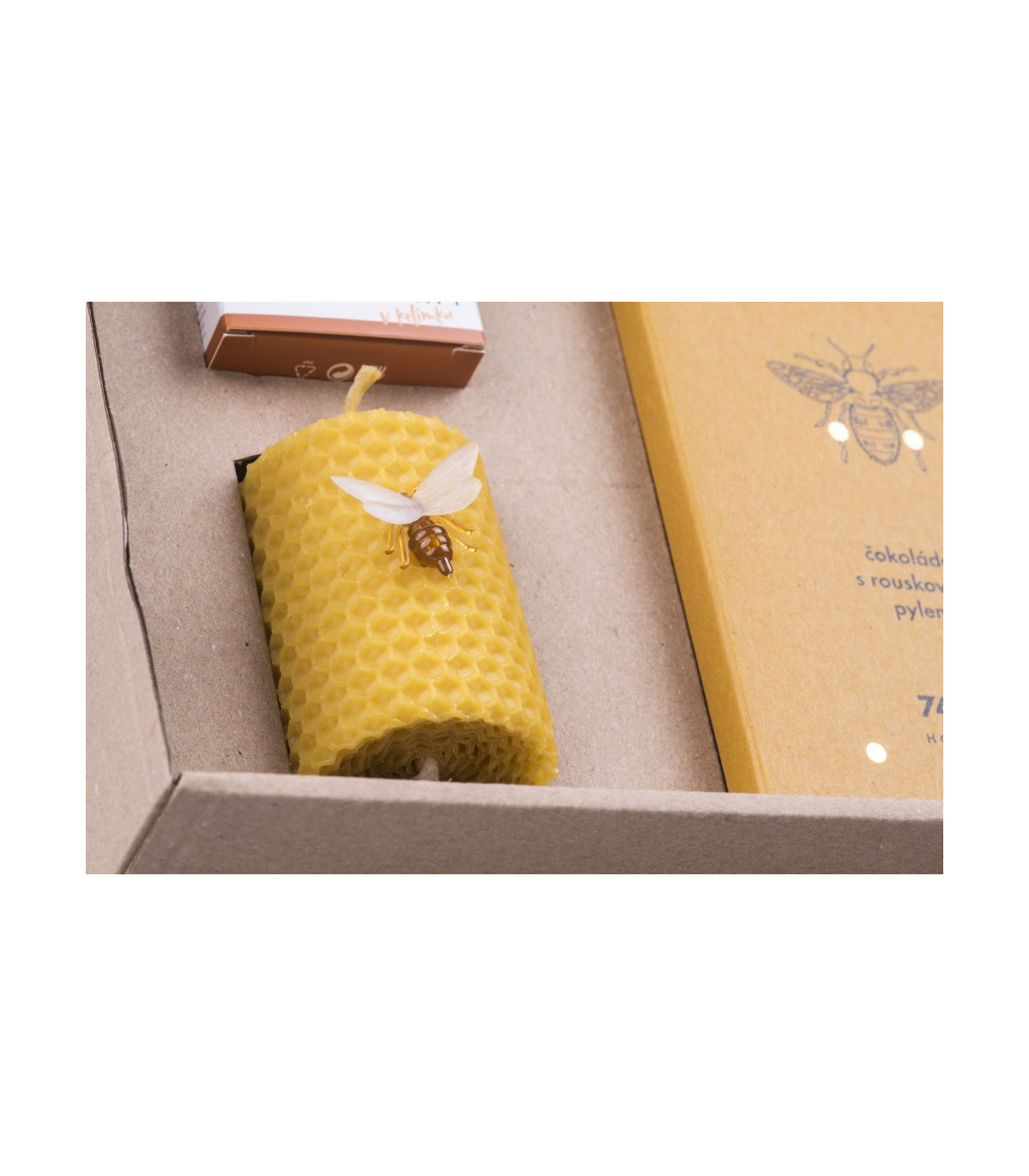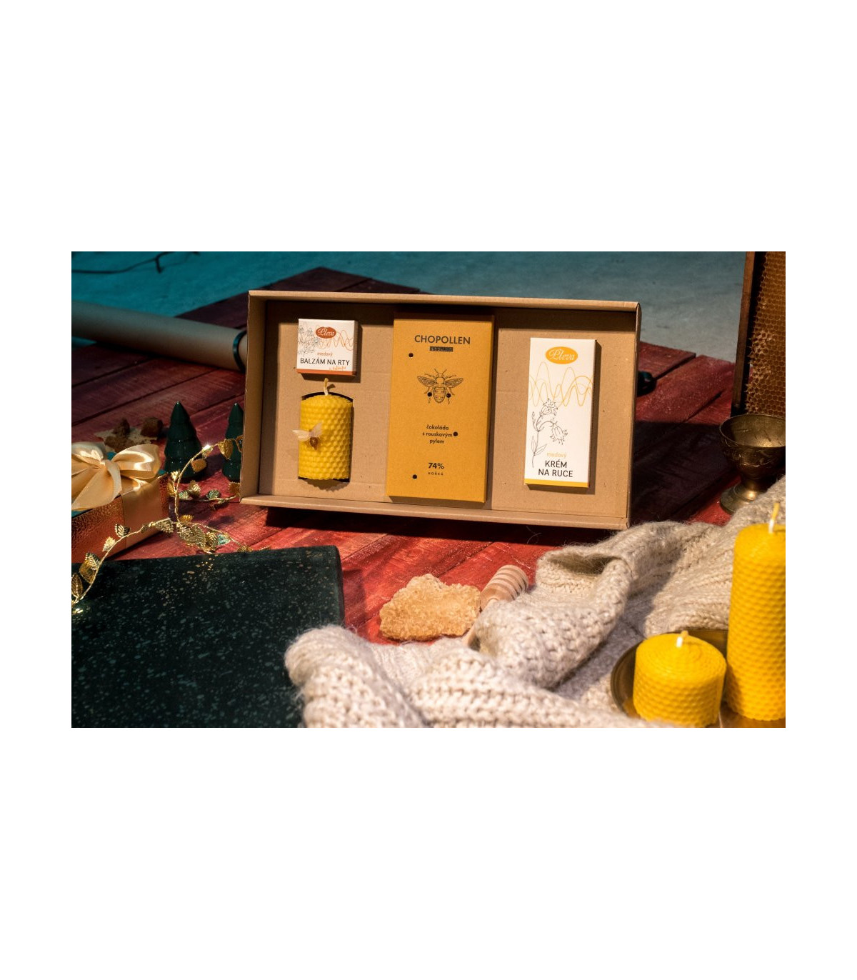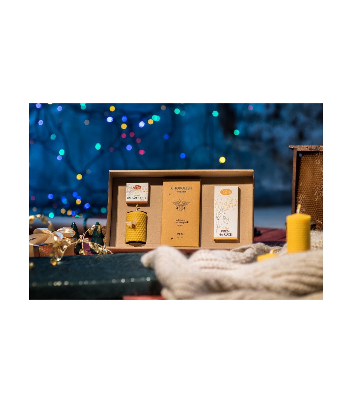Přírodní dárková sada plná zdraví a péče kombinuje originální a oblíbené včelí produkty a je okouzlujícím dárkem, s kterým nemůžete šlápnout vedle. Sada obsahuje medový krém s včelím voskem pro hebkou a provoněnou pokožku, balzám na rty s propolisem nebo svíčku z včelího vosku s jemnou medovou vůní. Zajímavostí je kvalitní hořká čokoláda s rouskovým pylem, která přináší neodolatelnou kombinaci a chuťový zážitek.
