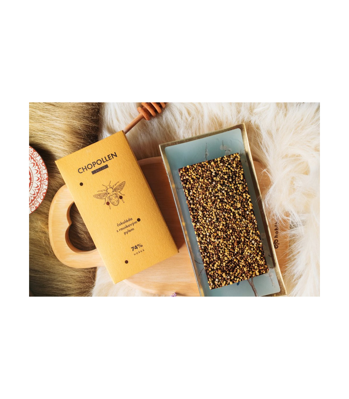 Chopolen spojuje kvalitní čokoládu a tradici poctivého včelařství. Posyp 74 % čokolády je tvořen rouskovým pylem, který obsahuje naprosto jedinečnou kombinaci látek, která vlévá krev do žil celé naší přírodě. Ne náhodou včelky krmí pylem celý úl. Spojení kvalitní hořké čokolády a blahodárného včelího pylu je neodolatelnou kombinací a chuťovým zážitkem.